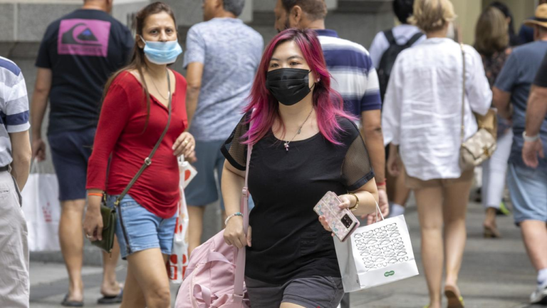 今月、ブリスベンのクイーンストリートモールでフェイスマスクをつけた人たち。写真リチャード・ウォーカー
