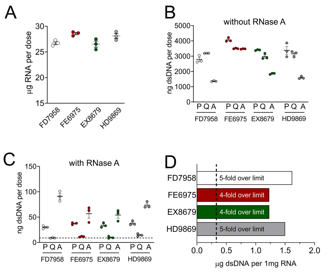 ファイザー社のワクチン(30μg)に含まれるRNAの量は妥当である。RNAから干渉シグナルを除去するためにRNaseで追加処理した後に検出された「実際の」DNAの量は、EMAの制限値の4~5倍を超えていた。