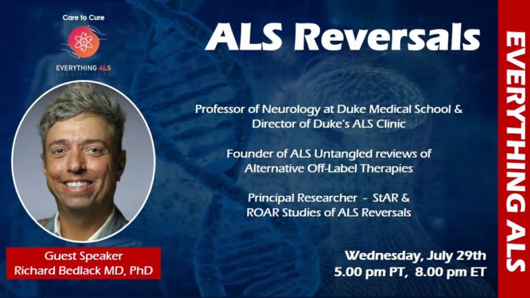 神経科医であるリチャード・ベドラック博士は、デューク医科大学のALSクリニックを運営している。 ALSコミュニティーのパイオニアであり、ALSの回復の原因に関する研究をリードしている。 2020年7月29日現在、彼は48人の逆転を確認している。 このプレゼンテーションでは、その研究内容に加えて、腸内環境、クレンブテロール、メチコバラミンに関する新たな研究についても言及された。