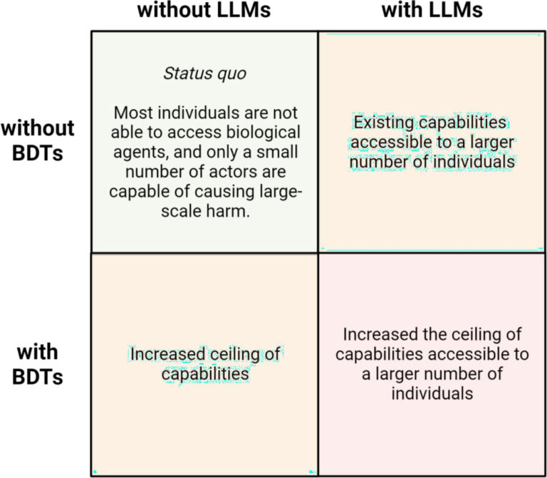 LLMsとBDTsの融合により、生物製剤による被害の上限が引き上げられ、生物製剤が広く利用されるようになる可能性がある。さまざまな介入がリスク管理に役立つであろう。