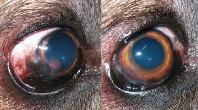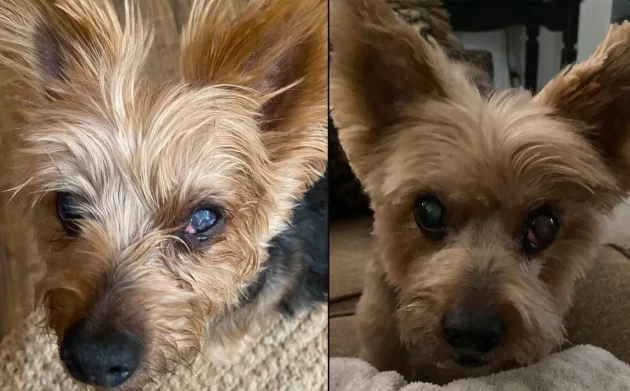 現在治療中のヨークシャーテリアの眼の損傷。片目は失明状態で、眼球は壊死しつつあった。視力回復は不明だが、眼球は治癒中だ。1枚目はDMSO/ヒマシ油点眼前の状態。2枚目は点眼2週間後の状態。1枚目では眼球の張りが失われているのが分かる。2枚目ではほぼ完全な球形に戻っている。