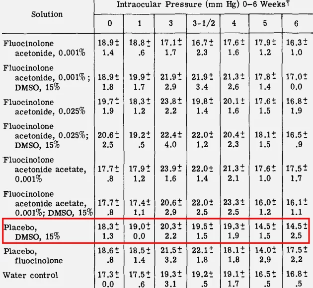 一方、DMSOの眼圧への影響を直接評価した私が知る唯一の研究(ウサギを用いた)では、経時的にDMSOが眼圧を効果的に低下させることが判明した: