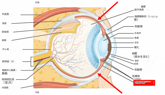 - DMSOは筋肉を弛緩させる:特に毛様体筋は収縮すると近視を引き起こす(この筋肉は眼球表面近くにあるため、DMSOの影響を受けやすい)。