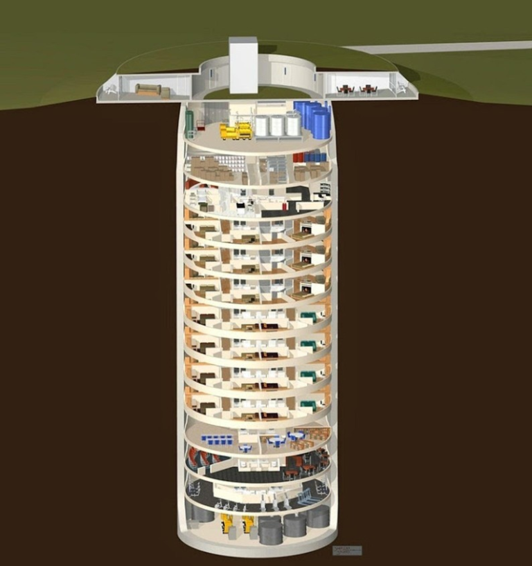 2008年にサイロを購入して以来、ラリー・ホールはこれを15階建ての逆タワーブロック、ジオスクレイパーに改造した。最大75人のコミュニティは、この地下の密閉された自給自足の贅沢な住居の中で最大5年間を乗り切ることができる。災害が過ぎ去れば、住民は黙示録後の世界(プレッパー用語でPAW)に出てきて再建することができる(図2)。