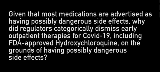 - ほとんどの薬は危険な副作用があると宣伝されているにもかかわらず、なぜ規制当局は、FDAが承認したヒドロキシクロロキンを含む初期の外来治療薬を、危険な副作用があるという理由で断固として否定したのでしょうか?