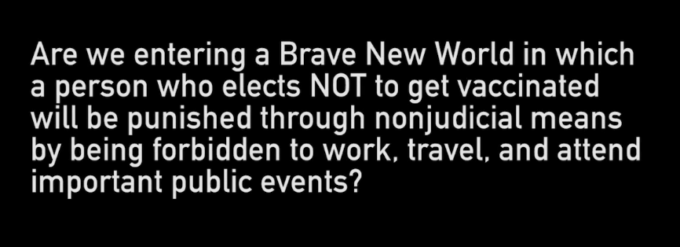 - 私たちは、ワクチンを接種しないことを選択した人が、仕事や旅行、重要な公共イベントへの出席を禁止されるという、非司法的な手段で罰せられるディストピアを迎えているのでしょうか?