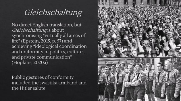 グライヒシャルトゥング(製造された適合性)の概念を軸に、生活のあらゆる領域における政治的・イデオロギー的同調の強制過程を分析している。ナチス時代の鉤十字の腕章やヒトラー敬礼が、COVID-19時代のフェイスマスクと同様の服従の象徴として機能したことを指摘している。
