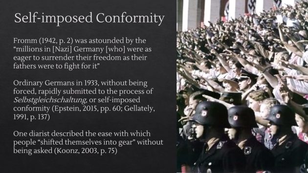 エーリッヒ・フロムの観察: 「ナチス・ドイツにいた何百万人もの人々が、父祖たちが自由のために戦ったように、自分たちも自由を放棄することを熱望していた」