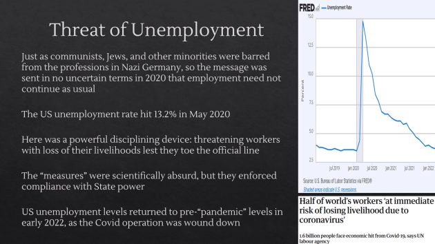 左派・労働組合の裏切り: 1932年の選挙でナチ党を上回る得票を得ていた社会民主党と共産党が団結できずにナチスの台頭を許したように、現代の左派勢力が生物安全保障国家に対する抵抗を放棄したことを指摘している。