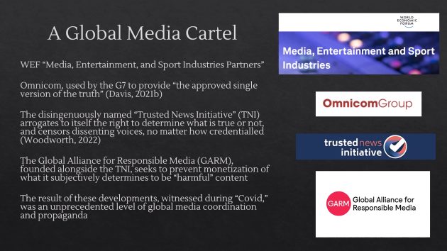 ナチス時代のプロパガンダは報道機関の統制、検閲、自己検閲の常態化を通じて実現された。現代においても、巨大テック企業による検閲、ファクトチェッカーによる言説統制、代替プラットフォームの排除などが行われている。メディア・カルテルのグローバル化により、COVID-19に関する前例のないレベルの世界的メディア協調とプロパガンダが実現された。政府の広告支出増加により、メディアは事実上国家統制下に置かれた。