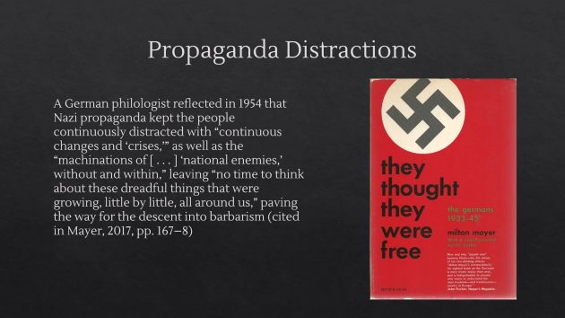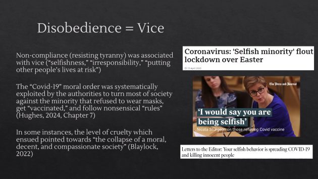 ナチス・プロパガンダの最も邪悪な側面は、敵意と排除の原則に基づく新しい道徳秩序の創造を通じて良心を乗っ取ったことである。COVID-19作戦においても同様に、政府ガイドラインに従うことが美徳・他者保護・正しい行いと同一視され、一方で非協力・専制政治への抵抗は悪徳・利己主義・無責任と関連付けられた。この道徳の事実上の転倒により、人々はマスク着用や封鎖支持が正しい行為だと信じるようになった。