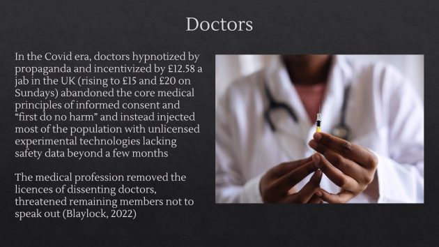 ナチス時代において職業がナチス化され、ユダヤ人や共産主義者が解雇された。ドイツ医師会はナチスの医療計画で重要な役割を果たし、後に強制的医学実験や安楽死に関与した。COVID-19時代においても、科学者や弁護士が権威主義政府と協力し、医師たちは基本的医学原則を放棄して実験的技術を国民に注射した。医学界は反対する医師の免許を剥奪し、残った会員に沈黙を強要した。