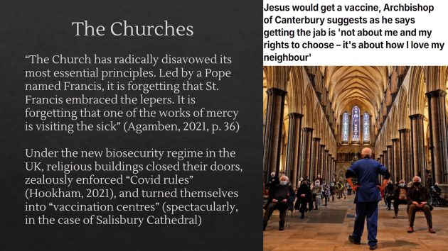 宗教機関の服従: ナチス時代のドイツのプロテスタント牧師やカトリック聖職者の国家社会主義への協力と、COVID-19時代における教会の生物安全保障体制への協力を比較している。特にソールズベリー大聖堂がワクチン接種センターとなった例を挙げている。