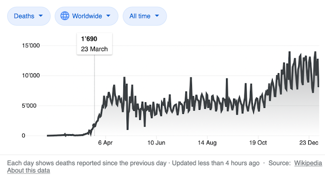 しかし、このトピックが注目を集めたのは 2021年1月中旬のことだった。[25] 2020年8月31日、ブルームバーグは次のようにも読めた。[26] COVID-19によって引き起こされたサプライチェーンの混乱の結果として、パンデミック自体よりも多くの人々が飢餓で死亡する可能性がある。1日あたり、12,000人である。その間、第一次世界大戦よりも多くの人がおそらくCOVID-19と取られた措置の副作用で死亡した!!!