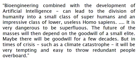 バイオエンジニアリングの開発と組み合わせることで、人工知能-人類を小さなクラスの超人と、下等で役に立たないホモサピエンスに分割することができるのである。超人であることは非常に危険である。そうなると、大衆の未来は、少数のエリートの善意にかかっている。もしかしたら、数十年間は善意があるかもしれない。しかし、危機の時代-たとえば気候の大混乱-には、余分な人間を海に投げ捨てることは非常に魅力的で簡単なことだろう。