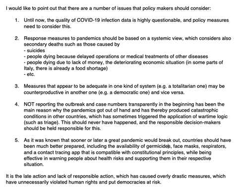 2020年3月30日午後3時ごろ、上記のテキストの変形がコンピューター雑誌でオンラインになった。[1]しかし、2時間後に再びオフラインになった。爆発的すぎる… また、2020年1月30日の法的手続きで、何が起こるかを見越して、トロリー問題の論理と(潜在的にアルゴリズムがサポートする)死の決定の適用は、-これが本当に必要か、または関連性がない場合、民主的で立憲的な社会秩序の中核的内容が脅かされ、「気候の緊急事態」などの危機的状況にあってはならない。しかし、裁判所はこの問題を取り上げることさえしなかった。それにもかかわらず、新聞記事[2]効果。ただし、インターネット検索で見つからない場合がある。一部の国では、死亡率がしばらくの間、ほぼゼロになった。その後、「第二波」が予言され、すべてが最初からやり直した。私たちは今、第四の波に達しており、第五の波はすでに予言されている。[3]