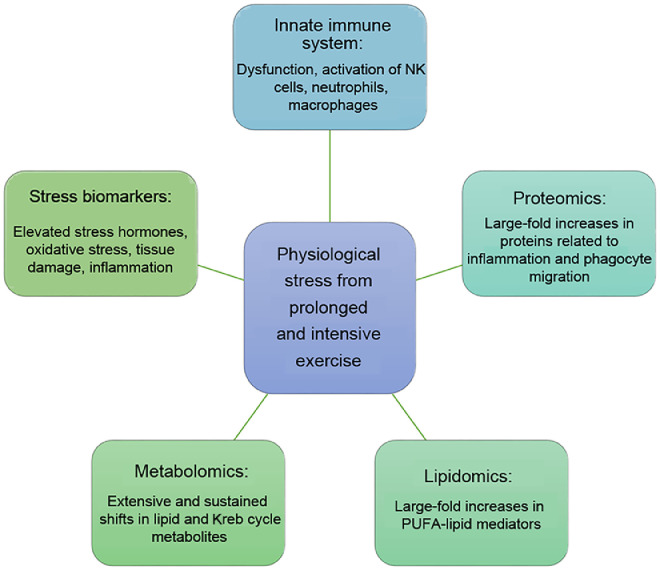 長時間の激しい運動による生理的ストレスを測定するための、免疫、ストレス、マルチオミクスのアプローチ。NK=ナチュラルキラー、PUFA=多価不飽和脂肪酸。