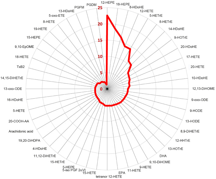 n=45種類のオキシリピンと基質脂肪酸であるアラキドン酸(ARA)EPA、DHAの運動誘発性増加(赤線で示した運動直後と運動前の比の値)104一晩絶食状態で75kmのサイクリングをした20名のアスリートから血液を採取した。5-iso PGF2αVI = (8ß)-5,9α,11α-trihydroxy-prostadienoic acid, 5-oxo-ETE = 5-oxo-eicosatetraenoic acid, 12-HHTrE = 12-hydroxy-heptadecatrienoic acid, 20-COOH-AA = 20-carboxy arachidonic acid; DiHDPA = ジヒドロキシ-ドコサペンタエン酸; DiHETrE = ジヒドロキシ-エイコサトリエン酸; DiHOME = ジヒドロキシ-オクタデセン酸; DHA = ドコサヘキサエン酸; EPA = エイコサペンタエン酸。EpOME = エポキシ-オクタデセン酸; HDoHE = ヒドロキシ-ドコサヘキサエン酸; HEPE = ヒドロキシ-エイコサペンタエン酸; HETE = ヒドロキシ-エイコサテトラエン酸; HETrE = ヒドロキシ-エイコサトリエン酸; HODE = ヒドロキシ-オクタデカジエン酸、HOTrE = ヒドロキシ-オクタデカトリエン酸、oxo-ODE = オキソオクタデカジエン酸、PGDM = プロスタグランジンD2代謝物、PGFM = 13,14-ジヒドロ-15-ケト-プロスタグランジンF2α、TxB2 = トロンボキサンB2。