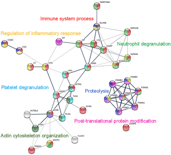 127,132,134,137,138 図4は、2.5時間の集中的なランニングまたはサイクリングを行った際に、急性に発現した29種類のタンパク質について、STRINGタンパク質-タンパク質相互作用を示したものである。好中球は、激しい運動後に炎症部位に移動する最初の細胞の一つであり、エラスターゼ、S100-A8,S100-S12,ディフェンシン、リゾチーム、白血球エラスターゼインヒビター、カテリシジン抗菌ペプチドなど、複数のタンパク質が好中球の活動状態の高まりを反映している127,134,137。138, 139 運動後のプロフィリン-1とアクチン(細胞質1)の増加は、好中球のアクチンフィラメント形成をサポートし、関与する組織への移動を促進する127, 132