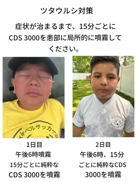 症状が治まるまで、患部に15分おきにCDS 3000を局所噴霧する。