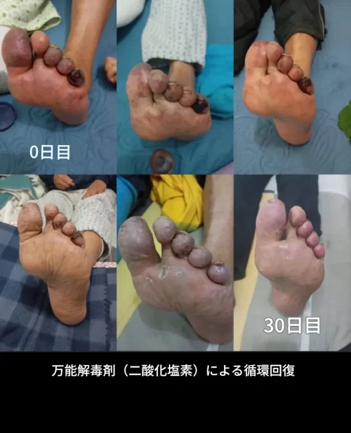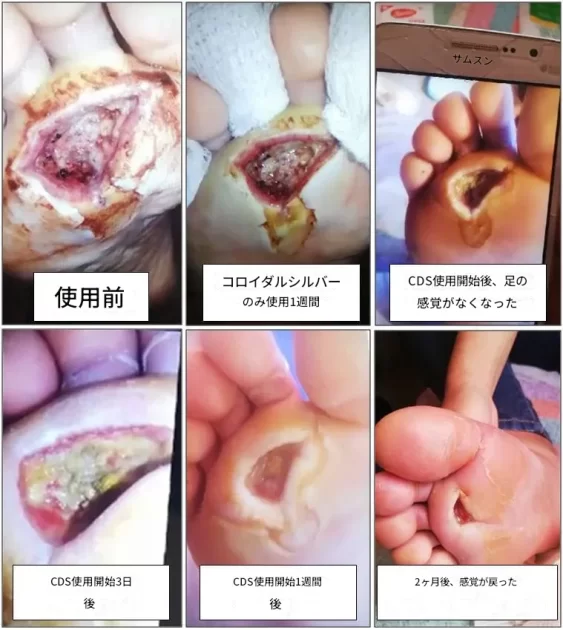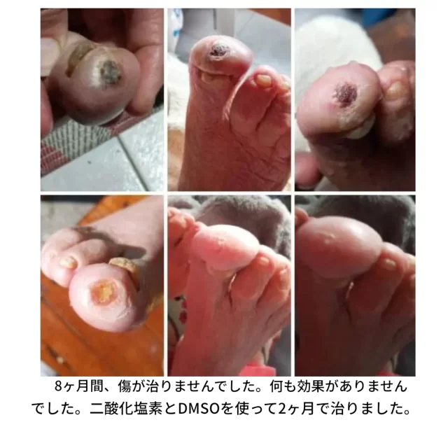 糖尿病性足潰瘍は、代謝異常、血管障害、免疫不全、感染など複合的な要因により難治化し、切断に至るケースが多い。二酸化塩素およびその誘導体(亜塩素塩)は、血糖コントロールの改善、微小血管の機能と組織酸素化の回復、抗炎症性マクロファージへの免疫シフト、直接的な創傷治癒促進、そして強力な抗菌作用など、多面的な機序でこの複雑な病態に同時に働きかける可能性が指摘される。7年以上治らなかった骨髄炎による足潰瘍、糖尿病性ニューロパチーを伴う潰瘍、2年間治癒しなかった下肢潰瘍、壊死性の外傷、静脈性潰瘍、虚血性足病変など、様々な治癒不全創傷が、二酸化塩素スプレー(時にDMSOや内服併用)により完全に治癒したとする詳細な証言と経過写真が提示される。