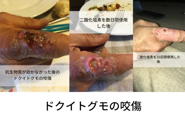 「茶色隠居蜘蛛に噛まれた。抗生物質を数日間使ったが効果が思わしくなかったため、CDSとDMSOを使うことにした。30mlの暗色ガラス瓶にDMSOを20滴、CDSを25ml入れ、傷口に直接スプレーした。最初の1週間は2時間おきに、その後は1日3回。これが10日間の治療結果だ」