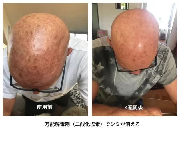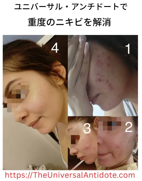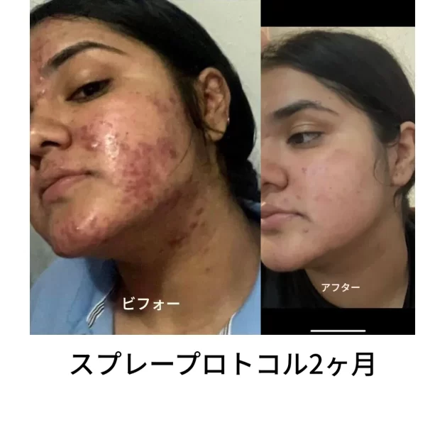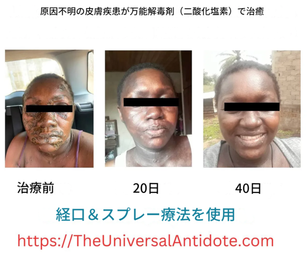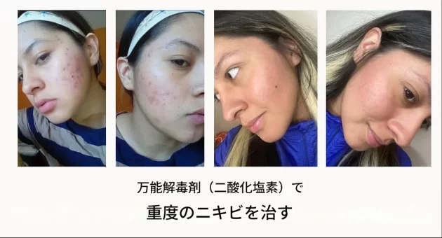 「これが、スプレーで二酸化塩素を塗布して2ヶ月も経たないうちに彼女の肌が改善した様子だ(服用すらしていない)。彼女は皮膚科医の治療をやめた」
