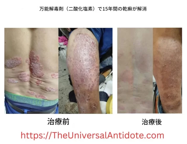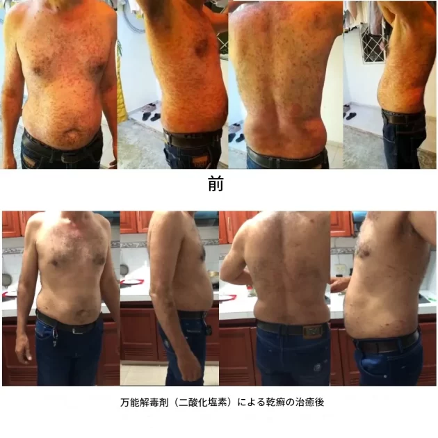 「38歳の男性。16歳から乾癬を患う。全身に広がっていたため、CDS50%と水50%をスプレーボトルに入れDMSOで治療。30日以内に効果現れ、現在もCDSプロトコルCを継続中。」