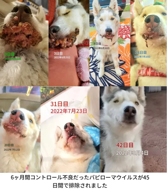 カルカー法でCDSを作成したが、1/2濃度(約1500ppm)で1ラウンドのみ。保護者がCDS1500に指を浸し、患部に1日2回軽く塗布した。