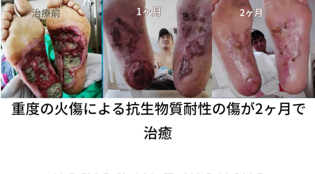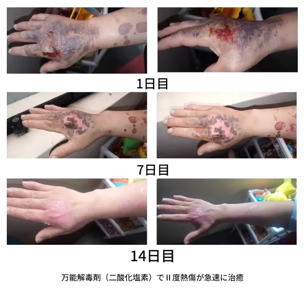 3枚目の写真は、CDSスプレーとプロトコルCを適用してから14日後に撮影。火傷はほとんど判別不能。」