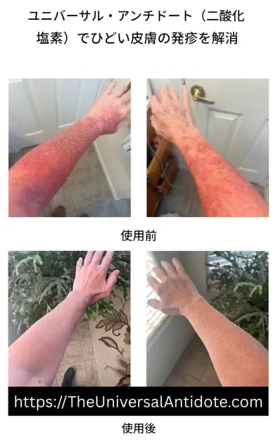 二酸化塩素スプレープロトコルは様々な皮膚症状に極めて有効であることが証明されているが、 その成功のメカニズムを常に完全に説明できるわけではない。ニキビのような症状は、本記事で先に論じたメカニズムと一致する可能性が高いため理解しやすい。一方、蕁麻疹や角化症などは不明瞭だが、結果は一貫している。また、二酸化塩素がツタウルシや化学刺激物による皮膚反応を素早く止めることも観察した。これらの効果の正確な作用機序は未だ不明だが、科学的説明が完全でなくとも、スプレー療法が驚くほど効果を発揮する事例が経験上数多くある。私の信条はこうだ。「試してみることに損はない」だ。