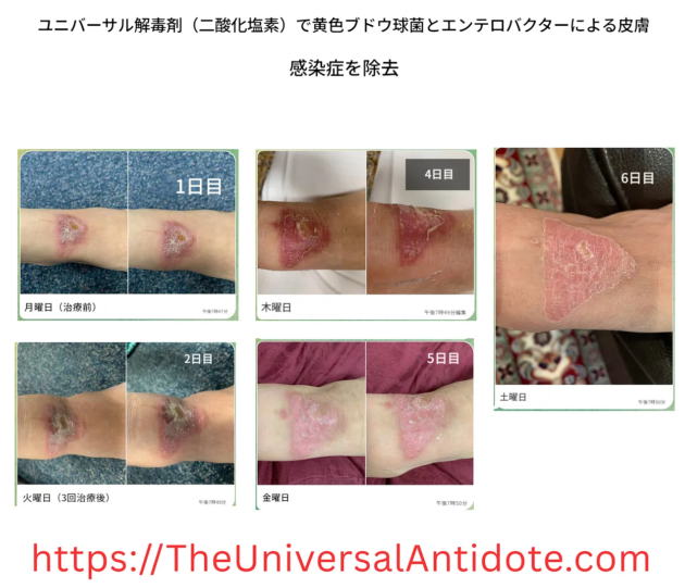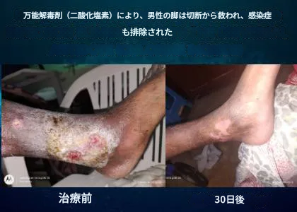 二酸化塩素は強力な酸化作用により、微生物の細胞壁・膜を破壊し、タンパク質を変性させ、核酸を不活化することで、細菌、ウイルス、真菌に対する広域の抗菌作用を発揮する。この章では、抗生物質耐性の腕の感染、切断目前の重度の下肢感染、黄色ブドウ球菌感染、犬咬傷後の感染、原因不明の細菌・真菌感染、糖尿病性壊疽を伴う火傷感染など、様々な重度の感染症が、二酸化塩素の外用(および時に内服併用)により劇的に改善したとする複数のビジュアル証言が紹介される。多くの症例で、従来の医療(抗生物質の静脈内投与など)が失敗した後に、このプロトコルが奏功したと報告されている。