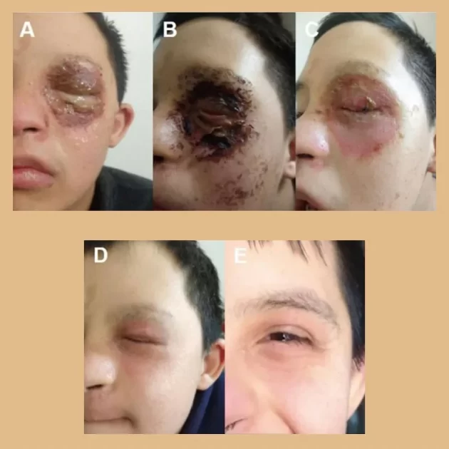 「熱による眼瞼火傷後の皮膚再生経過。(A)治療0日目の病変;(B)治療2日目の病変;(C)治療4日目の病変;(D)治療14日目の病変;(E)治療22日目の病変。