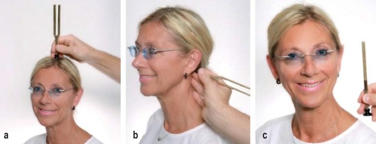 a)ウェーバーテスト。このテストでは、440 Hzで振動する音叉の柄を患者の頭頂部に当てる。両耳の聴力が正常な患者は、音を両耳で均等に聞くことができる。右側が聞こえにくい患者の場合、音叉の音が右側で大きく聞こえる場合、伝音性または外耳の障害が疑われる。しかし、音が左側で大きく聞こえる場合、右側の感音性難聴が示唆される。b)およびc) リンネテスト。この検査では、まず患側耳の後ろにある乳様突起(骨伝導を検査する)に、振動する音叉を当てる。患者に音が聞こえるかどうか、また聞こえなくなった瞬間を伝える。次に音叉を外耳だけに当てる(気導を検査する)。この位置でも患者が音を聞こえる場合、リンネテストの結果は陽性(「正常な所見」)となる。音が聞こえない場合は、検査結果は陰性となる。