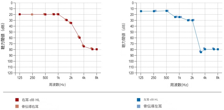 老人性難聴における典型的な純音聴力検査(両側性、ほぼ対称性、主に高周波数の感音性難聴)