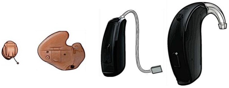 補聴器のデザインの種類(概略図)、左から右へ:完全耳かけ型(CIC)、耳かけ型(ITE)、レシーバーインカナル型(RIC)、耳掛け型(BTE)