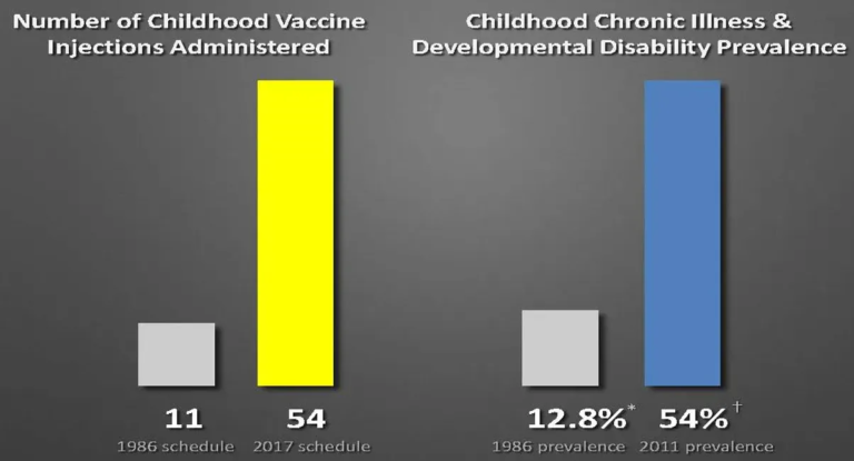 1986年当時、DPTワクチンの危険性は十分に認識されており、DPTワクチンが引き起こした脳障害や乳幼児の突然死に対して定期的に訴訟が起こされていた(こちら)。この法律は、ワクチン製造業者を製造物責任から保護し、ワクチンで負傷した子どもの親を救済することを意図したものであった(実際にはそうではなかったが)。この法律が成立したことで、業界は実験的で責任のないワクチンを市場に送り出そうとゴールドラッシュとなり、やがて小児ワクチン接種スケジュールは慢性疾患の増加と並行して膨れ上がった。