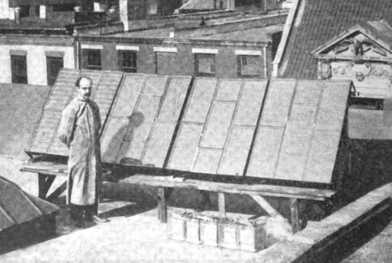 写真上 3 つ目の太陽電池アレイの横に立つジョージ・コーブ氏。出典はこちら 太陽光による発電」、『ポピュラー・エレクトリック』、第2巻、第12号、1910年4月、pp.793。