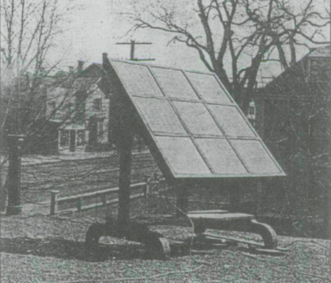 上図。ジョージ・コーブの3枚目の太陽電池パネル。パネルが平らになっているのとは対照的に、斜めに傾いている。出典はこちら。Literary Digest 1909。