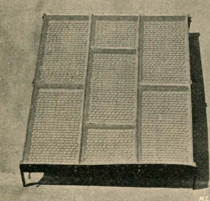 上の写真。ガラスカバーを外した Cove の第 3 太陽電池アレイの太陽電池パネルの 1 つ。出典 「太陽光の利用」、ルネ・ホーマー、Modern Electrics、Vol.II、No.6,1909年9月。
