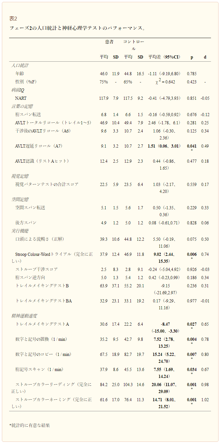 表2 第2相人口統計学と神経心理学的検査の成績。