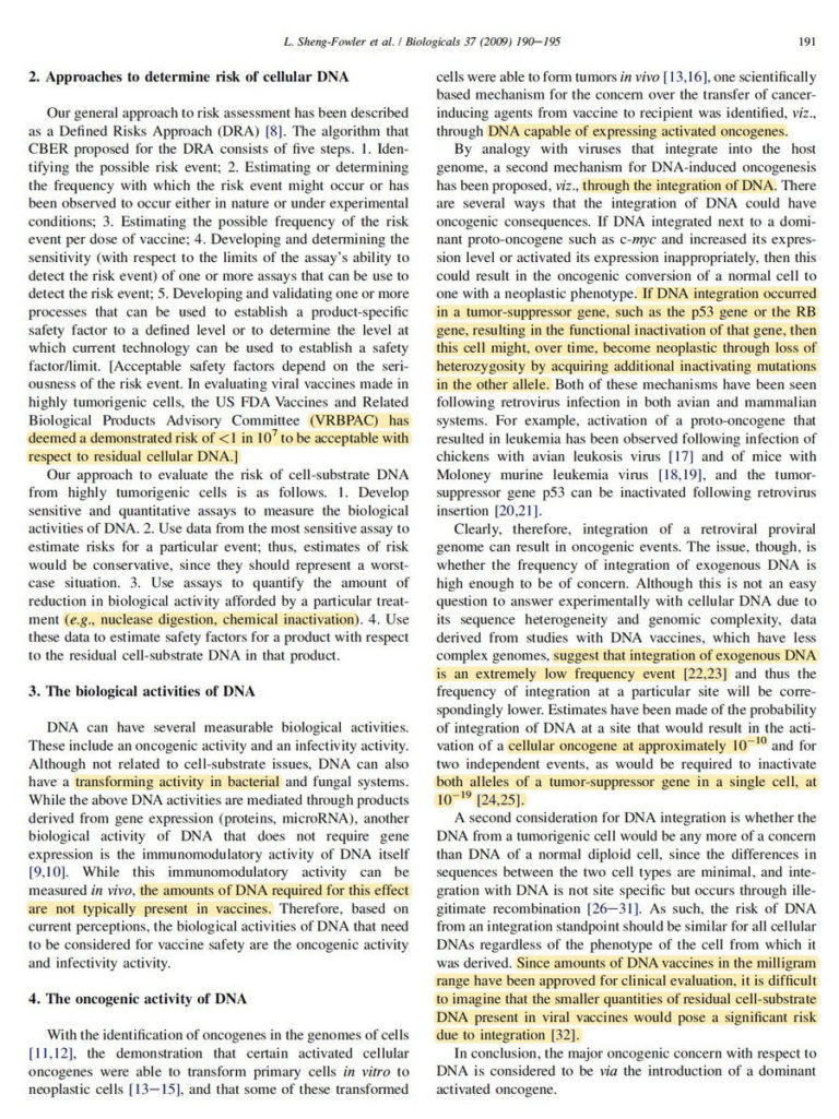 細胞ゲノムにがん遺伝子が同定され[11,12]、活性化した細胞がん遺伝子が試験管内試験で初代細胞を腫瘍化することができ[13e15]、これらの腫瘍化した細胞の一部が生体内試験で腫瘍を形成することができることが示され[13,16]、ワクチンからレシピエントにがん誘発物質が移行するという懸念が科学的に根拠あるメカニズムの1つとして明らかになった、すなわち、活性化がん遺伝子発現可能DNAを介してというもの。