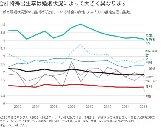 婚姻率と出生率の関連性を結びつけるのは難しくない。結局のところ、女性の出生率が婚姻状況によって異なることは驚くべきことではない: