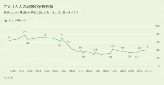 ギャラップ調査によれば、理想的な家族に3人以上の子どもを含むと考えるアメリカ人の割合は、第二次世界大戦後のピーク時からほぼ半減している: