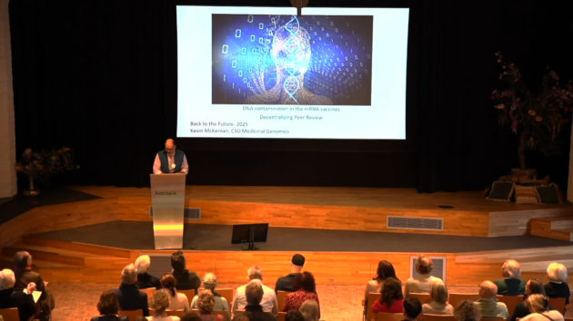 ケビン・マッカーナン氏は、自身のキャンペーン茶に関する研究から話を始める。パンデミック初期にうつ病や不安症が増加することを予見し、安全性の高い抗うつ剤としてシロシビンを含むキノコのゲノム解析を行っていた。その研究中、ファイザー製mRNAワクチンの品質管理検査のために使用した医薬品グレードのmRNAから、意図せずプラスミドDNAを発見したのである。