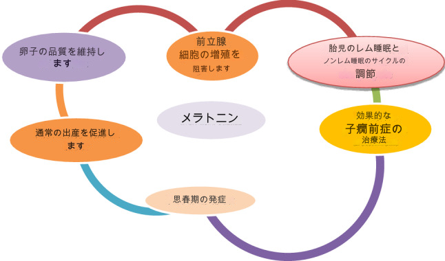 - メラトニンは生殖機能の調節にも関与している。多嚢胞性卵巣症候群(PCOS)などの生殖器系疾患との関連も示唆されている。