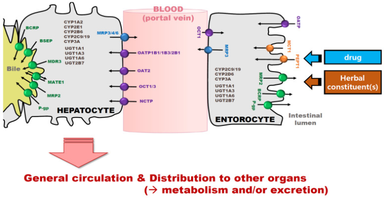 膜(腸細胞の頂膜、肝細胞の洞膜、腎近位上皮細胞の基底膜など)を介して組織内に入った生薬中の薬物や化学物質は、受動的な拡散やトランスポーターによって制御される。そして、生薬に含まれる薬物や化学物質は、第I相および第II相の代謝酵素による代謝および/またはトランスポーターを介した排泄(例えば、腎排泄または胆汁排泄)によって除去される[24,25,26]。具体的には、重要なPKパラメータであるバイオアベイラビリティーは、腸内取り込みおよび排出トランスポーター、腸内代謝酵素、および肝取り込みによる代謝を含むファーストパス効果の結果として変動する。一方、分布、代謝、排泄の変化は、主にそれぞれの組織における取り込み・排出トランスポーターの調節や代謝酵素の阻害・誘導によって起こる。これらのADME経路は、生薬や医薬品の血漿や組織への曝露の程度を決定し、それによってHDコンビネーションの有効性と毒性を説明する[11,17,27,28]。