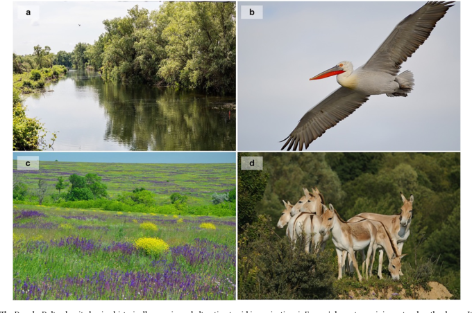 WWF(世界自然保護基金)は、地球上で最も貴重な200の生態系地域のひとつとみなしている(World Wildlife Fund, 2020a)。写真:Diego Delso, delso.photo, CC BY-SA. (b) ダルメシアンペリカン(Pelecanus crispus)は、前世紀の間に数が減少している(Catsadorakis, 2019)。ダルマペリカンが営巣するのに必要な撹乱は最小限で、水に囲まれた島や葦原に営巣する(Crivelli, 1996)。ドナウデルタは、ヨーロッパに残る個体群のほとんどを受け入れており、この種の世界的な保全にとって重要な場所である(Endangered Landscapes Programme, 2020a)。(c) 湿地帯の北東50kmに位置するが、機能的には湿地帯とつながっているタルチノ草原は、ユーラシア・ポント草原の最大の残存地であり、デルタとともに保護されている(Endangered Landscapes Programme, 2020a)。写真:Maxim Yakolev, CC BY-SA 4.0 (d) クーラン(Equus hemionus kulan)は、主に狩猟(Endangered Landscapes Programme, 2020b)と農業開発により、数百年にわたって生態系から姿を消していたが、現在はタルチノ草原に再導入されている(Endangered Landscapes Programme, 2020a)。タルチノ草原は、在来の肉食動物にとって新たな餌場となると同時に、草原が開かれた状態を維持するのに役立つだろう(Endangered Landscapes Programme, 2020b)。また、クーランをはじめとする大型草食動物は、草原と湿地帯を行き来することで、草原と湿地帯をつなぐ重要な役割を担っている(Endangered Landscapes Programme, 2020a)。写真提供:Michael Oppermann, CC BY-SA 3.0.