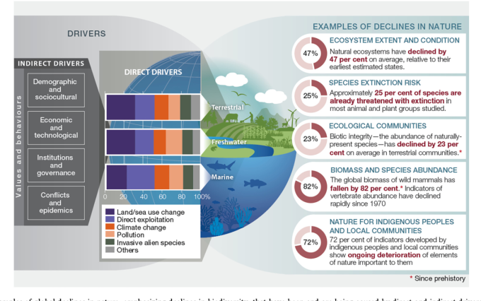 世界的な生物多様性の減少は、増え続ける人々と急速に拡大する経済的支援システムが、他の生物種を駆逐していることを最もよく理解している。保全生物学者は、生物多様性喪失の直接的な要因として、生息地の喪失、種の乱獲、汚染、外来種、気候変動の5つを挙げている。世界評価報告書