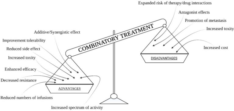 併用療法は、個々の単剤療法の投与量を減らすことで副作用を軽減することも可能である。残念ながら、異なる治療法を併用することで、患者への害が増すこともある[7]。